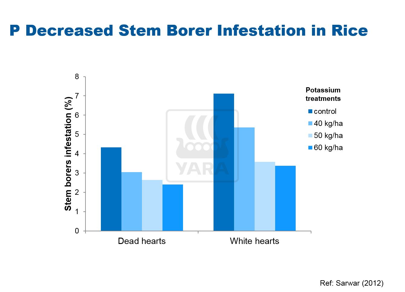 칼륨 비료는 많은 작물에서 병충를 감소시키는 것으로 알려져 있습니다. 예를 들어 아래 연구 결과는 칼륨 공급이 해충에 의한 쌀의 침입을 감소 시켰음을 보여줍니다. 해충은 묘목 단계에서부터 성숙 단계까지 식물의 어느 단계에서든 벼 작물에 큰 피해를 줄 수 있습니다. 해충은 분얼지에 침입하여 식물 단계에서는 속마름이나 고사를 일으킵니다.